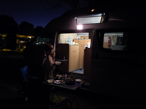 キャンピングカーで調理。