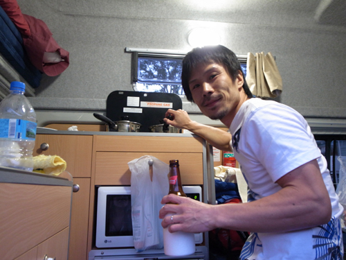 キャンピングカーで調理。