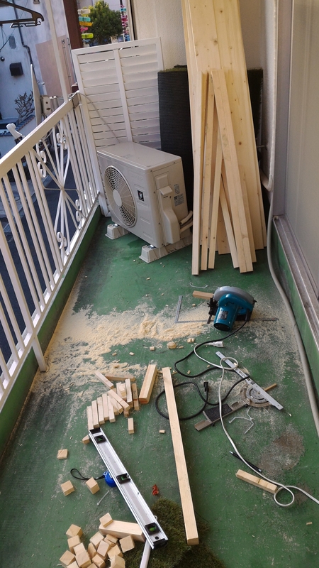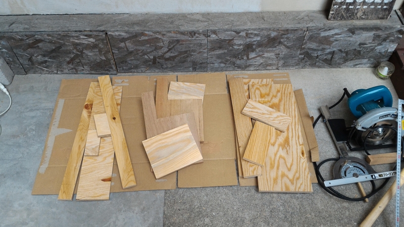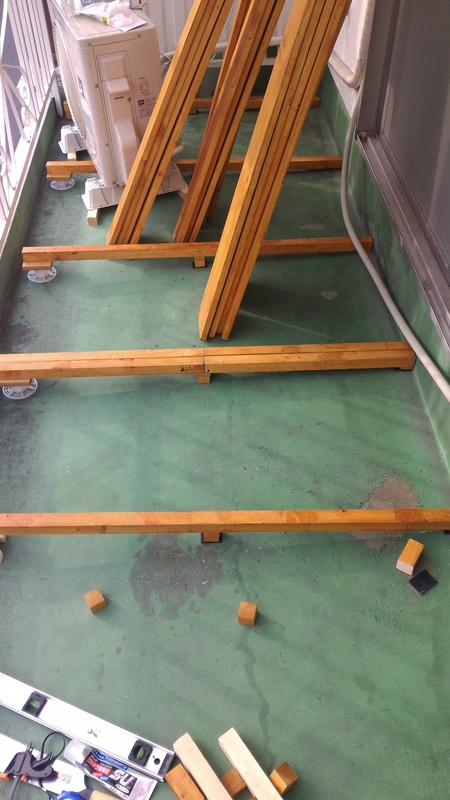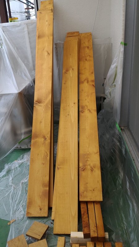 土台になる根太の部分(手前)と、床板を17枚、裏表とサイドを塗っていきます。